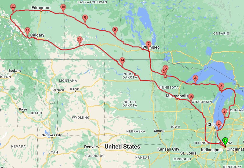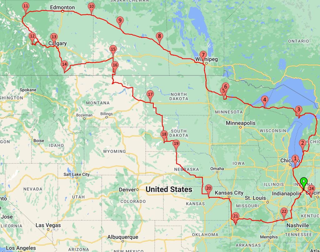 This was the Route map we planned for this trip. We left August 20 and planned to return October 15. We followed the plan up to stop #11 at Jasper National Park. The map below shows the route we took home.The trip to Jasper was as planned up to Jasper National Park (where we were staying at Hinton KOA – #11 on the map). However, after 20 days, including five days at Jasper National Park, we got the terrible news that our son Daniel had died. We left John and Pam and headed straight home to Indianapolis from Jasper; as fast as we could. This revised map shows what we actually did and the sad, anxious 4 day trip back home to family and friends. There is so much that could be said, so many thoughts and prayers on that day and the days since; so much tension between ‘we don’t want to think about it’ and ‘we don’t want to forget’. It has taken so long to get back to this post that many things are jumbled and forgotten. But, up to that point, it had been a good trip with memories we do not want to forget so what follows are photos and memories of the first 20 days.