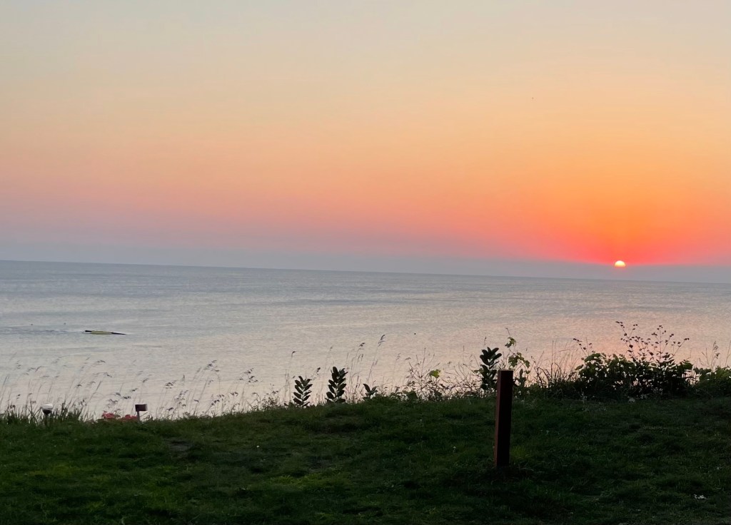 The steep steps down to Lake Michigan from Buttersville Campground in Ludington, MI. We saw some colorful reddish sunsets from this campground which we later figured out were mostly due to the beginning stages of Canadian wildfire smoke in the air. The smoky air would get much worse as we traveled further north.Sunset over Lake Michigan.