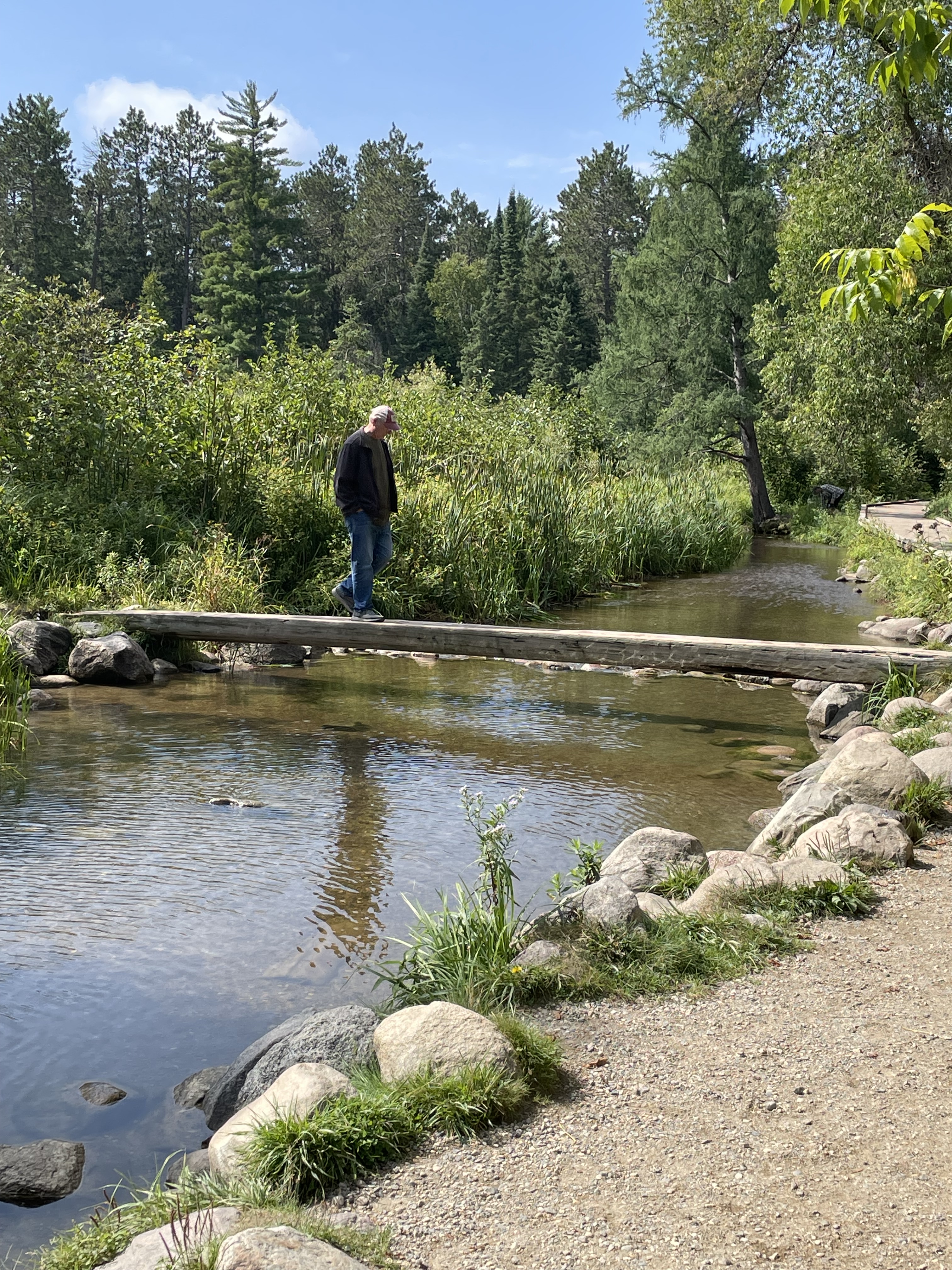 Saturday, August 26 we arrived at Itasca State Park, Minnesota. This is the shallow stream exiting the lake where Lake Itasca becomes the headwaters of the Mississippi River. Hard to imagine this little stream eventually drains 40% of the continental United States (all or part of 31 States).I walked across the Mississippi on a log.