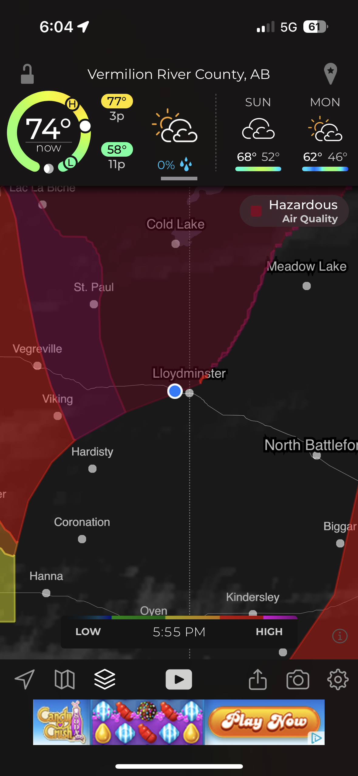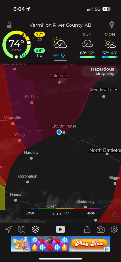 Our last stop before Hinton was “Camp N RV” in Lloydminster. This picture from my phone shows the worst air quality of “Hazardous” that we encountered.