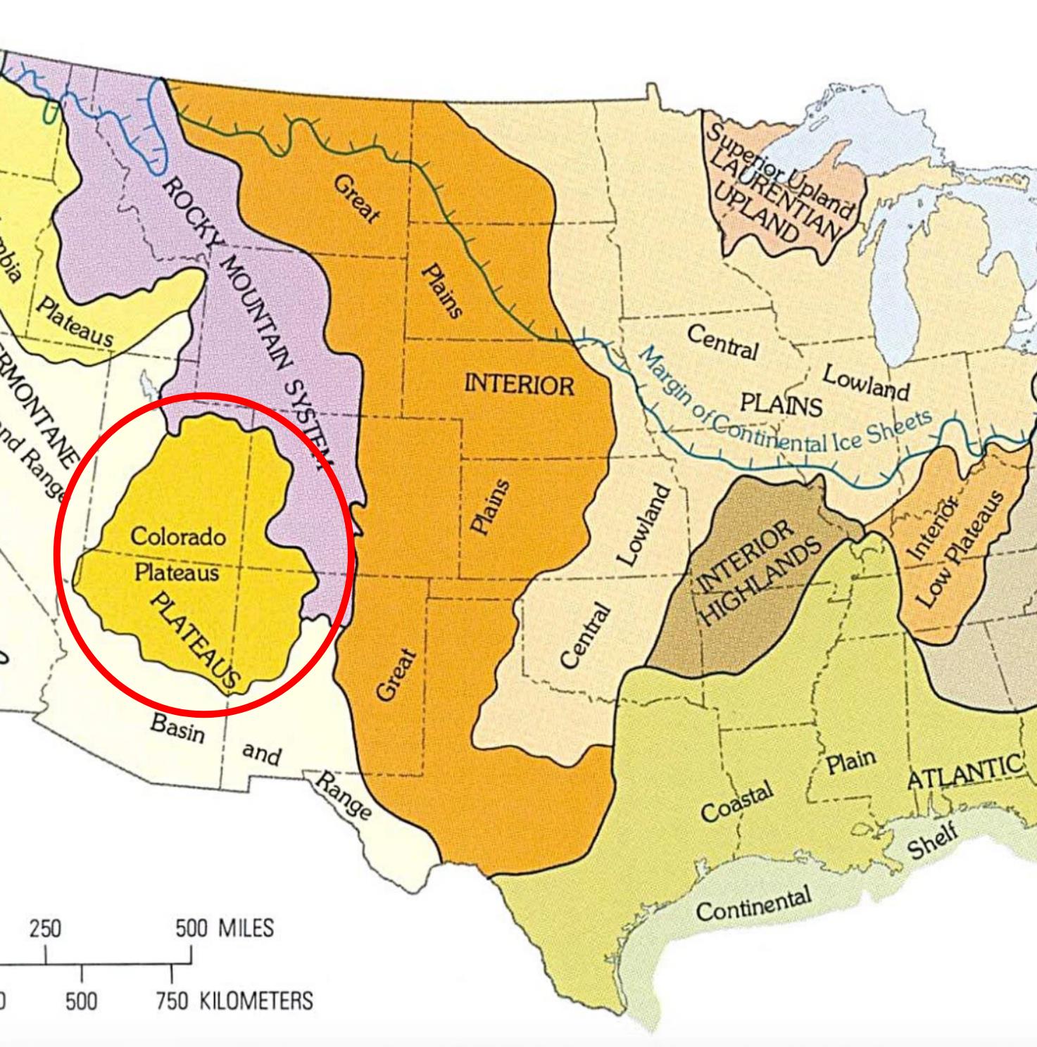 Below is a map of “US Terrain Regions” as mapped by the US Geological Survey. When we left Indianapolis in the Central Lowland Plains, traveling west through the Great Plains, then crossing the Rocky Mountain System, we arrived at the Colorado Plateau(s). I thought we were just headed to a bunch of National Parks in the Utah vicinity. I had no idea there was a name for this densely packed geological wonderland called “The Colorado Plateau”