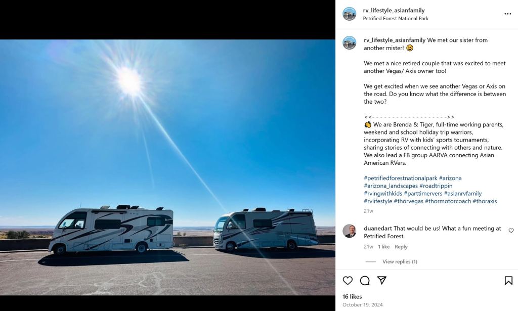 Our RV on the right, Brenda & Tiger family on the left. Their Instagram is rv_lifestyle_asianfamilyThey took a picture too and posted to their Instagram; this is a screen capture of that post. We very seldom see another Axis/Vegas while driving so to have one pull up and park is cause for some celebration. Hats off to them traveling in a 25′ RV with a family of four and a dog.