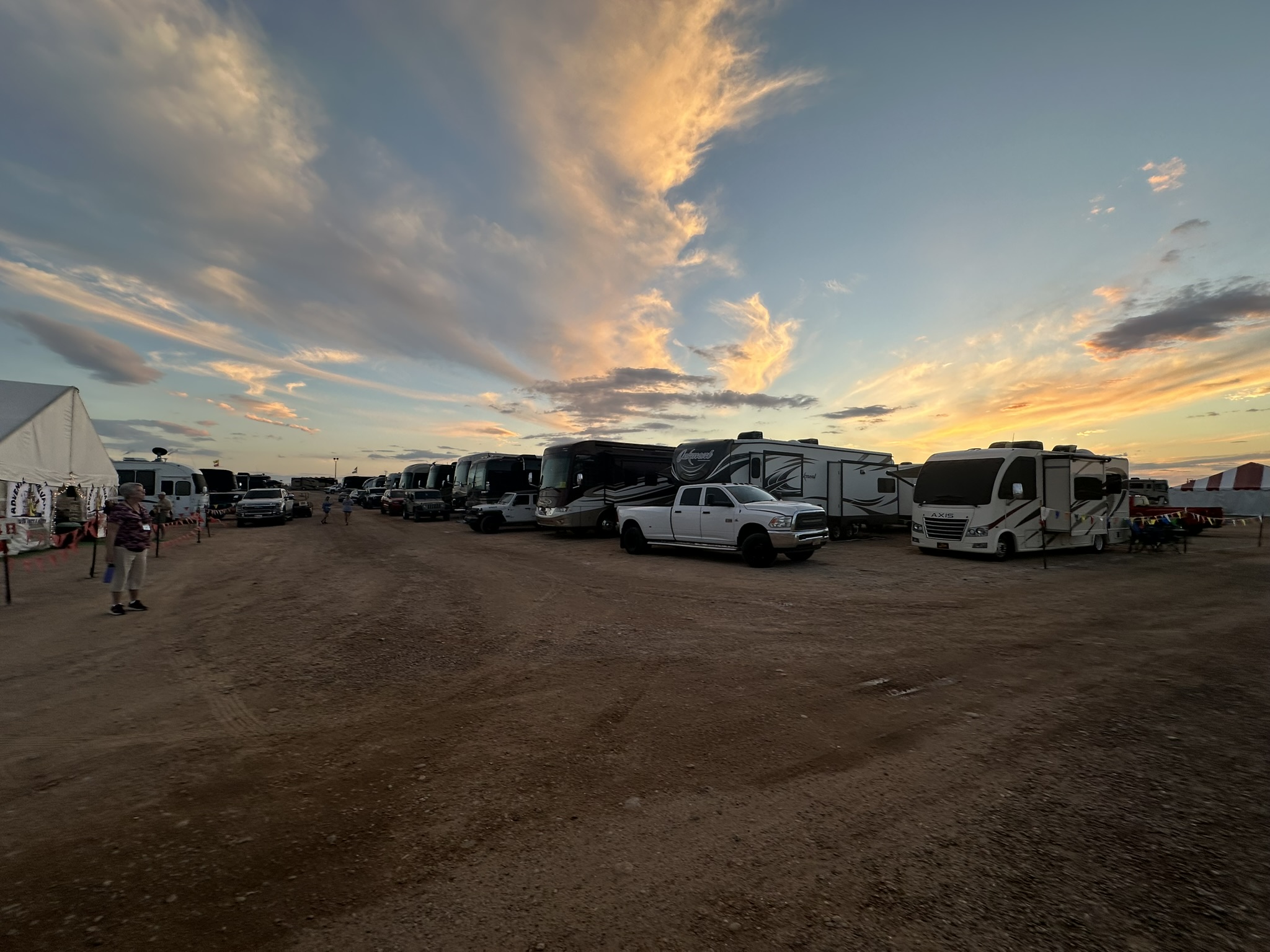 Sunset the first night. Our RV on the right. The Adventure Caravan hospitality tent on the left (with Becky standing out front). Behind me about 1/2 mile from this photo is the launch field where balloons would rise and most often drift directly over us. Just to the right of this photo is a big patch of scrubby desert where some of the balloons would land.